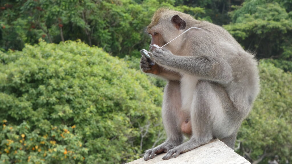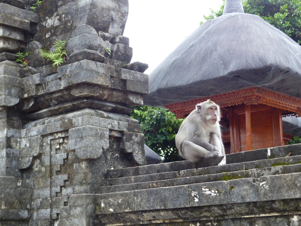 Moins idyllique est la présence de singes pickpockets qui s’attaquent aux touristes, avec une rapidité fulgurante, ils surgissent de derrière un mur ou de la végétation pour voler les lunettes qu’ils cassent ensuite, ou de tout autres objets à leur portée. On doit être sur ses gardes en permanence, mais nous assistons à plusieurs attaques, la plupart réussies !