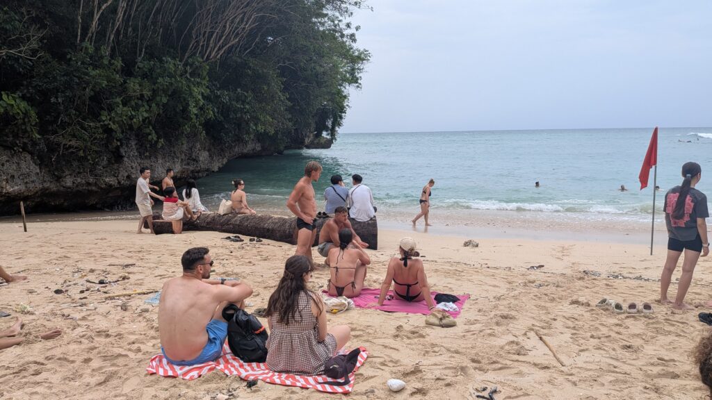 Nous ne sommes plus les seuls occidentaux parmi une foule d’indonésiens, ici, beaucoup d’australiens. Nous arrivons le jour de la fête nationale australienne, ils affichent les couleurs bruyamment. Globalement on est dans une station balnéaire occidentale : bars avec musique, salon de massages, boutiques de vêtements…