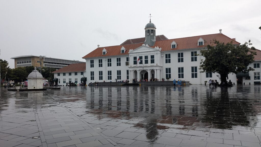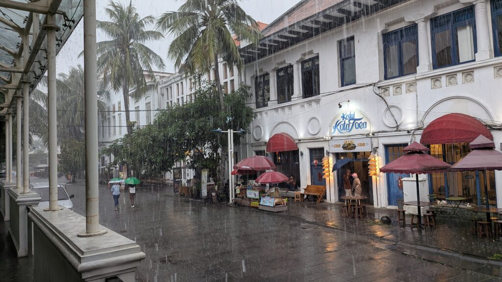 Aujourd’hui nous avons visité le quartier historique de Kota Tua, l’ancienne Batavia, colonie hollandaise. Pas de chance, en sortant de la station de train, les premières gouttes commencent à tomber et ça ne s’arrêtera pas avant 17h, avec de bonnes averses par moment.
