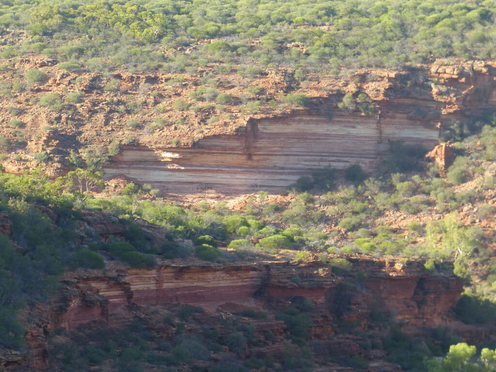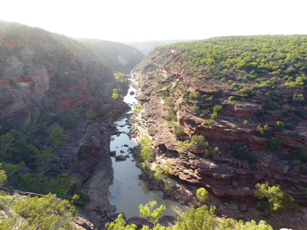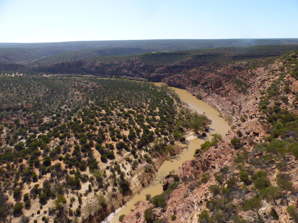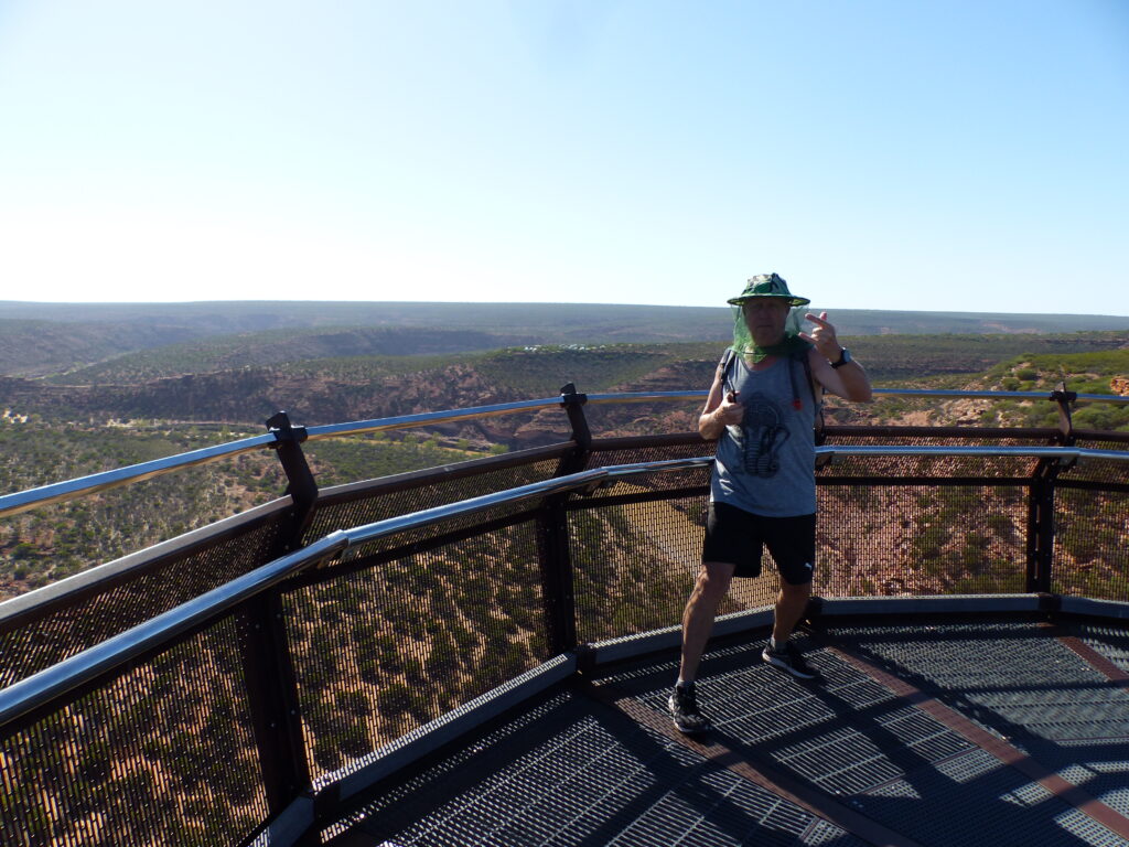 Notre périple touche à sa fin, c’est notre dernier jour « touristique » . Nous avons écouté les conseils et sommes arrivés dans le parc national de Kalbarri le plus tôt possible, il est 7h30 il fait 23°. Nous commençons par le plus physique, une petite rando à la fraîche. Les mouches sont déjà là et nous assaillent, mais nous avons nos chapeaux à filet pour les tenir à distance de notre visage.