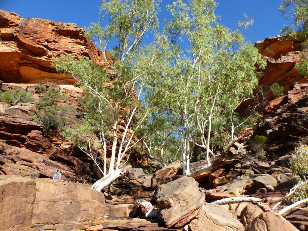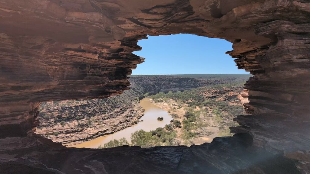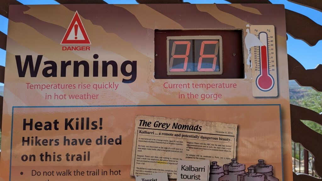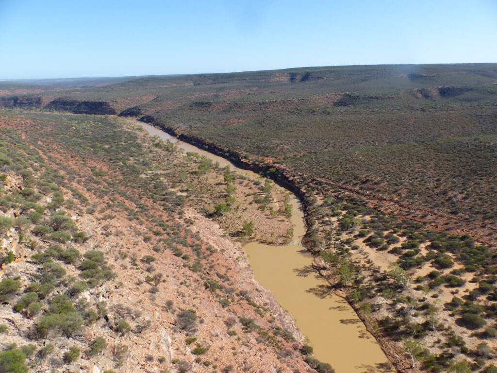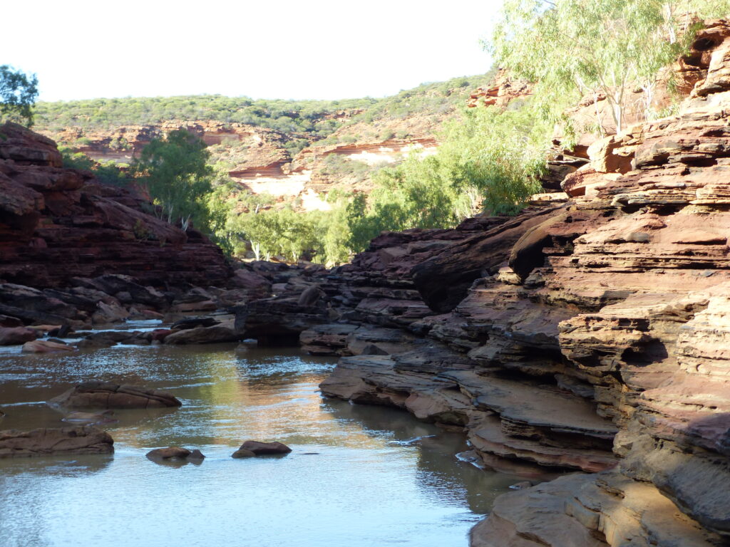 Notre périple touche à sa fin, c’est notre dernier jour « touristique » . Nous avons écouté les conseils et sommes arrivés dans le parc national de Kalbarri le plus tôt possible, il est 7h30 il fait 23°. Nous commençons par le plus physique, une petite rando à la fraîche. Les mouches sont déjà là et nous assaillent, mais nous avons nos chapeaux à filet pour les tenir à distance de notre visage.