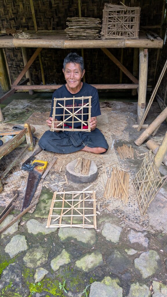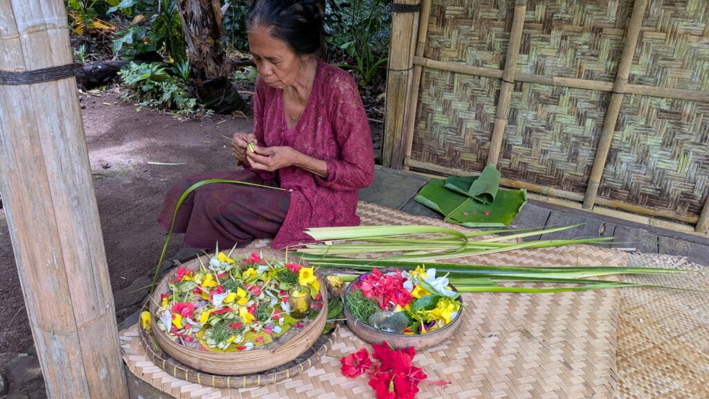Nous assistons à la fabrication d’offrandes qui sont déposées quotidiennement devant les maisons, les temples … Elles sont fabriquées avec des feuilles de bananier tressées en petites corbeilles qui sont garnies avec des pétales de fleur, un biscuit, un bâton d’encens…